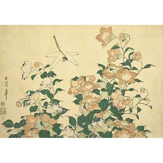 Bell Flower And Dragonfly Black Modern Wood Framed Art Print by Hokusai