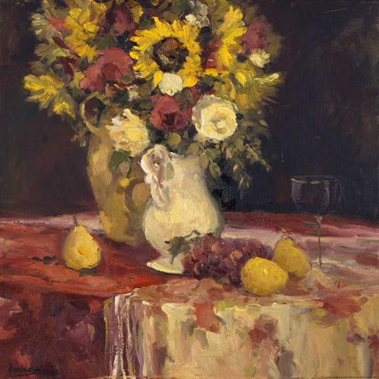 Sunflowers And Wine Black Modern Wood Framed Art Print by Stevens, Allayn