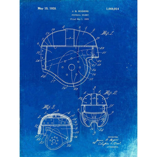PP218-Faded Blueprint Football Helmet 1925 Patent Poster Black Modern Wood Framed Art Print by Borders, Cole