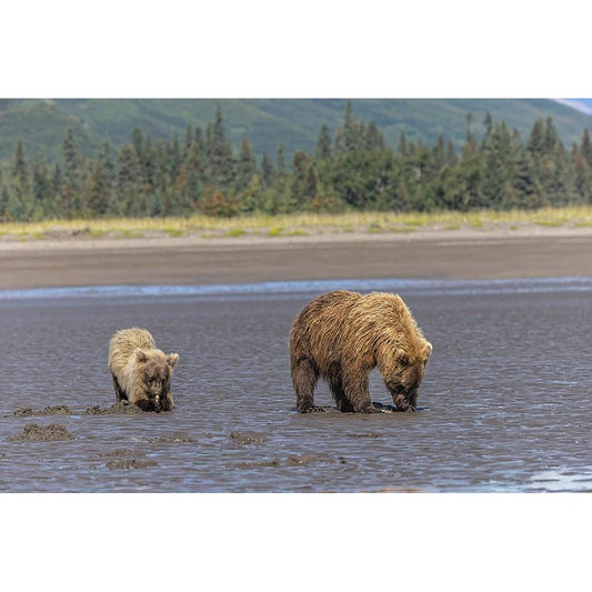 Adult female grizzly bear and cub clamming-Lake Clark National Park and Preserve-Alaska White Modern Wood Framed Art Print by Jones, Adam