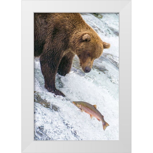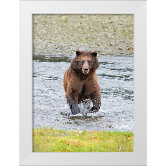 Brown bear chases after a salmon dinner at Pack Creek. White Modern Wood Framed Art Print by Sederquist, Betty