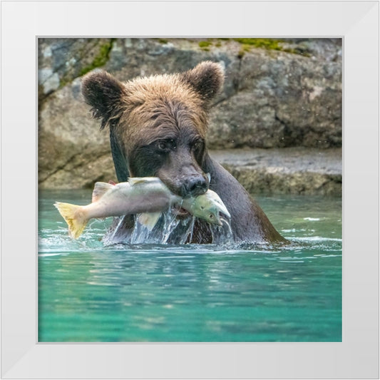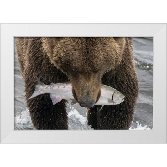 Alaska- Brooks Falls. Grizzley bear holding a salmon in its mouth. White Modern Wood Framed Art Print by Muir, Janet