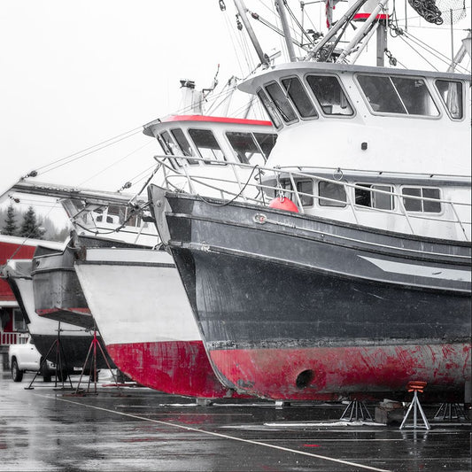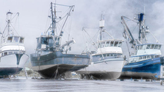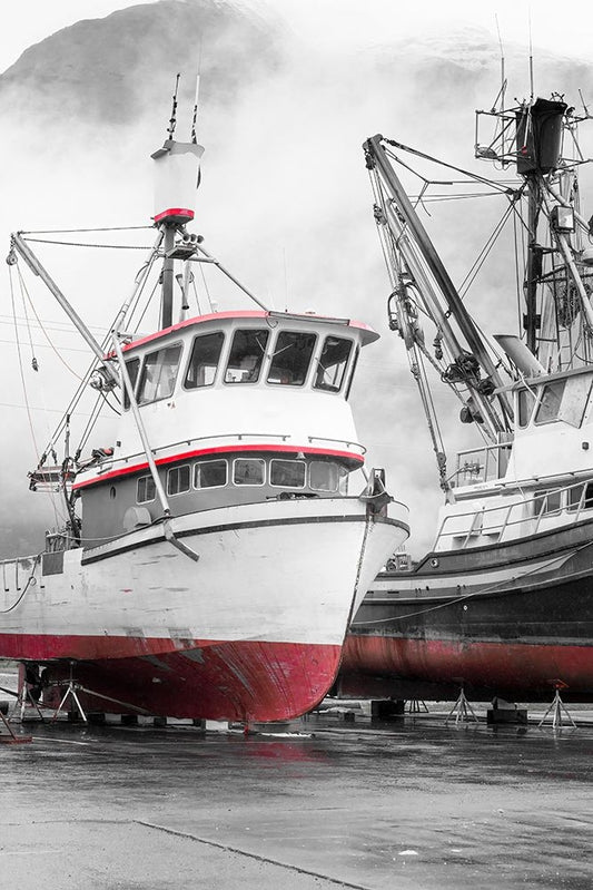 Alaska- Valdez. Fishing boats on dry dock. Artistic rendering. White Modern Wood Framed Art Print with Double Matting by Muir, Janet