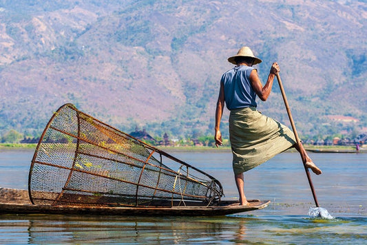 Inlay Lake-Shan State-Myanmar-Fisherman poles his canoe White Modern Wood Framed Art Print with Double Matting by Haseltine, Tom