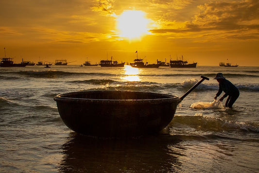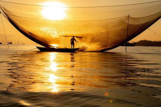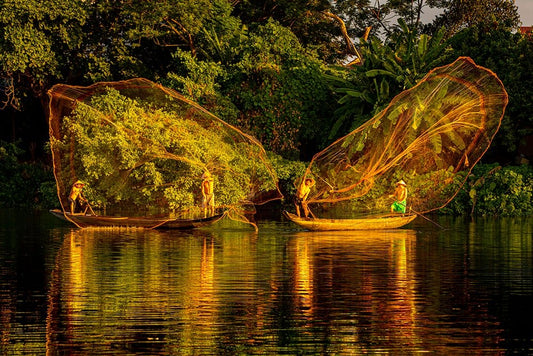 Vietnam-Fisherman emptying the nights catch in the Lagoon White Modern Wood Framed Art Print with Double Matting by Norring, Tom