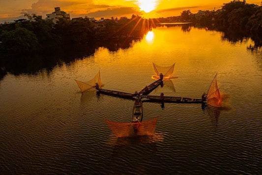 Vietnam-Coordinated lagoon fishing with nets at sunset White Modern Wood Framed Art Print with Double Matting by Norring, Tom