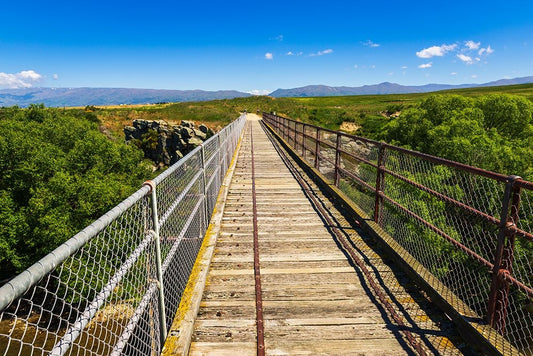 The Manuherikia River bridge on the Otago Central Rail Trail-Otago-South Island-New Zealand White Modern Wood Framed Art Print with Double Matting by Bishop, Russ