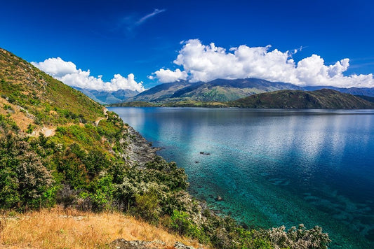 Cycling the shore of Lake Wanaka-Otago-South Island-New Zealand White Modern Wood Framed Art Print with Double Matting by Bishop, Russ
