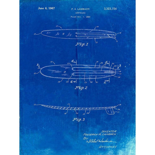 PP1073-Faded Blueprint Surfboard 1965 Patent Poster Black Modern Wood Framed Art Print with Double Matting by Borders, Cole