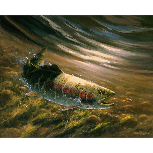 The Chase - Rainbow Trout Black Modern Wood Framed Art Print with Double Matting by Langton, Bruce