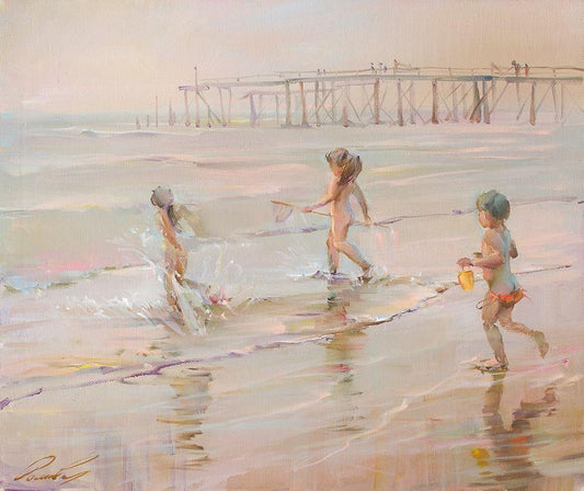 Children and the ocean White Modern Wood Framed Art Print with Double Matting by Romanov, Roman