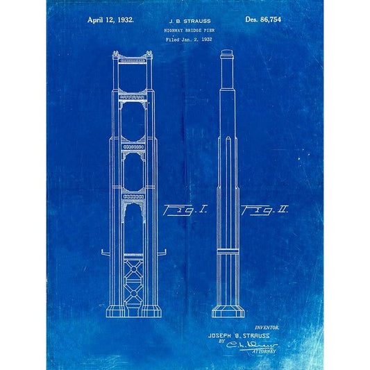 PP321-Faded Blueprint Golden Gate Bridge Main Tower Patent Poster Gold Ornate Wood Framed Art Print with Double Matting by Borders, Cole