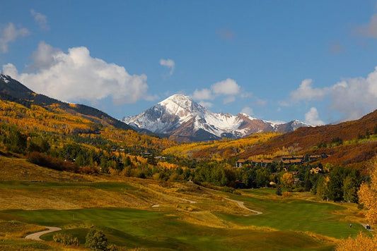 Snowmass golf course with view of Mt Daly in autumn Black Ornate Wood Framed Art Print with Double Matting by Ostrowitz, Mallorie