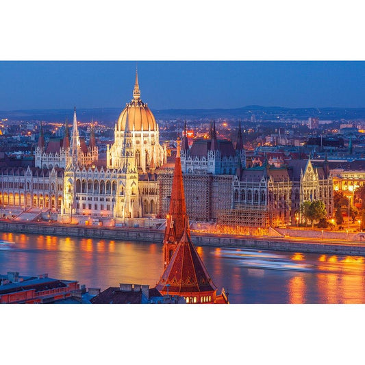 View of Parliament Buildings along Danube River at dusk-Budapest-Capital of Hungary-Europe Gold Ornate Wood Framed Art Print with Double Matting by Haseltine, Tom