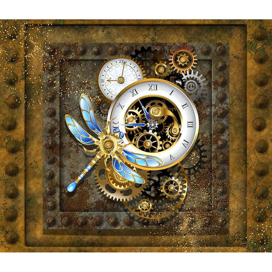 Steampunk Dragonfly Clock Black Modern Wood Framed Art Print by Mitchell, Tina