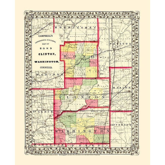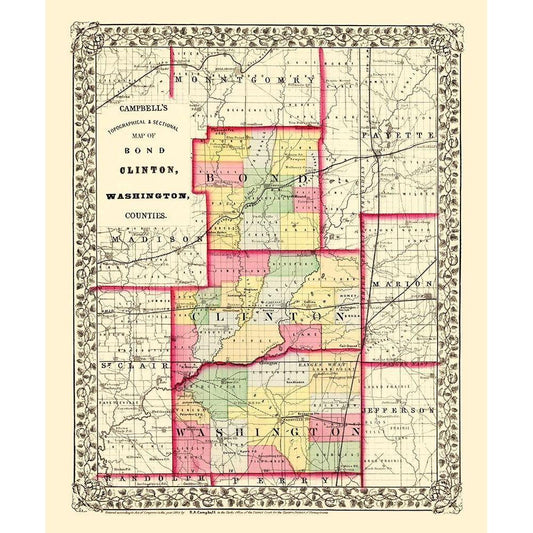 Bond Clinton Washington Illinois - Cambell 1870 Gold Ornate Wood Framed Art Print with Double Matting by Cambell