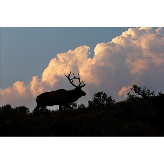 Bull elk or wapiti silhouetted on ridge at sunrise-Yellowstone National Park-Wyoming Gold Ornate Wood Framed Art Print with Double Matting by Jones, Adam