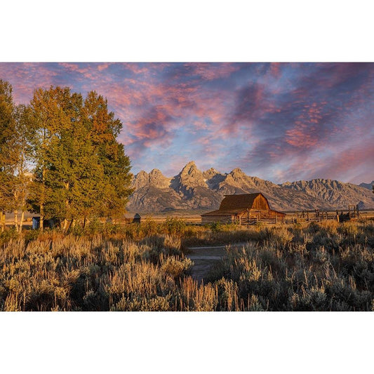 Moulton barn at sunrise and Teton Range-Grand Teton National Park-Wyoming Gold Ornate Wood Framed Art Print with Double Matting by Jones, Adam
