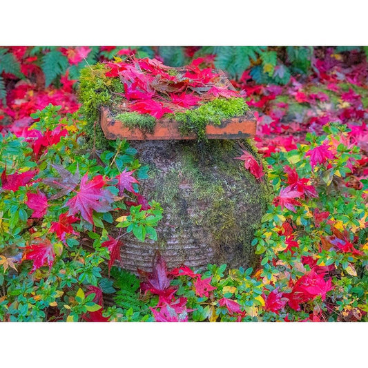 USA-Washington State-Pacific Northwest-Sammamish and red Japanese Maple leaves fallen around pot Gold Ornate Wood Framed Art Print with Double Matting by Gulin, Sylvia