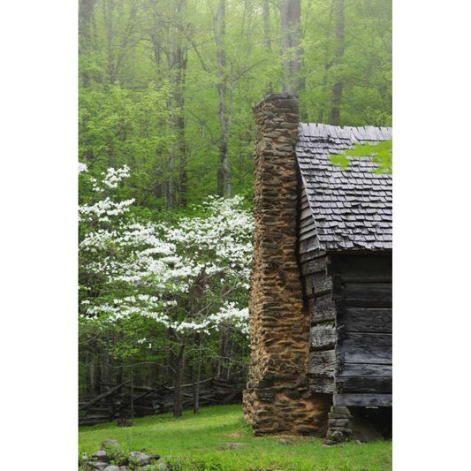 TN, Great Smoky Mts Log cabin and blooming trees Gold Ornate Wood Framed Art Print with Double Matting by Flaherty, Dennis