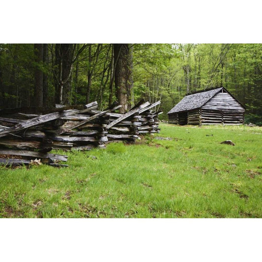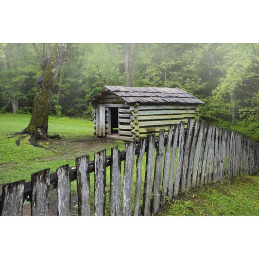 TN, Great Smoky Mts Fence and abandoned cabin Gold Ornate Wood Framed Art Print with Double Matting by Flaherty, Dennis