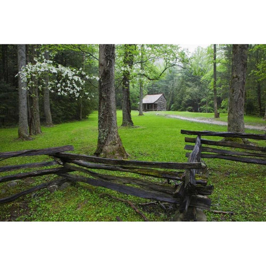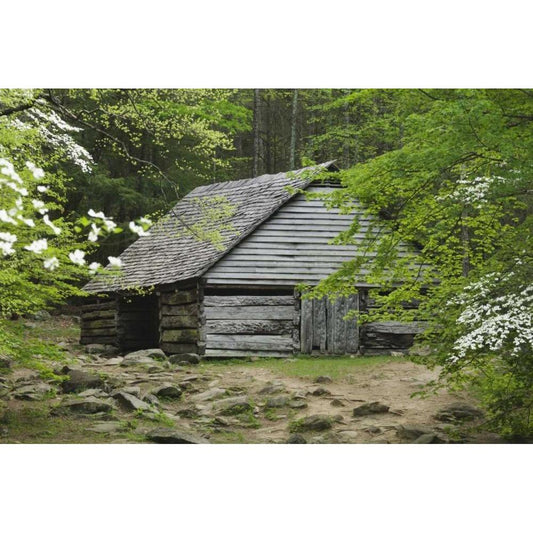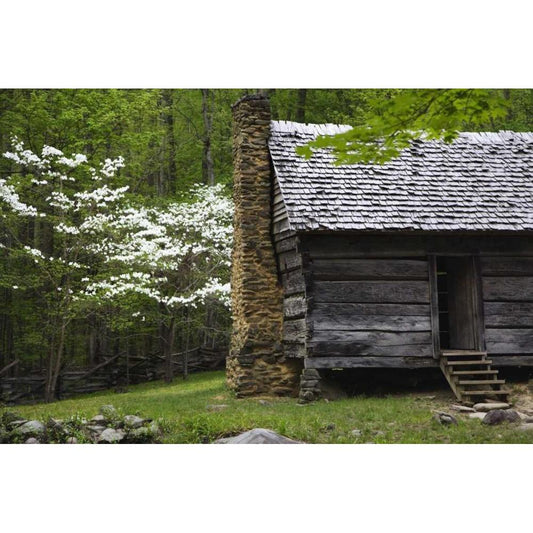TN, Great Smoky Mts Log cabin and blooming trees Gold Ornate Wood Framed Art Print with Double Matting by Flaherty, Dennis