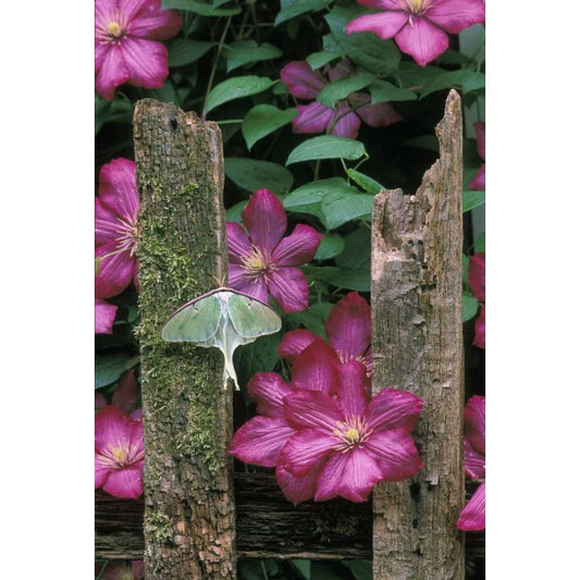 Pennsylvania Luna moth on fence with flowers Gold Ornate Wood Framed Art Print with Double Matting by Rotenberg, Nancy