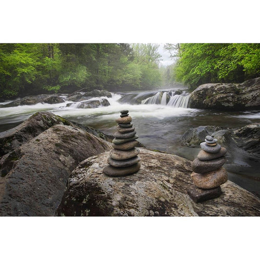 Cascading mountain stream and rock cairns-Great Smoky Mountains National Park Gold Ornate Wood Framed Art Print with Double Matting by Jones, Adam