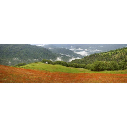 CA, Redwoods Mountain scenic with old barn Gold Ornate Wood Framed Art Print with Double Matting by Paulson, Don