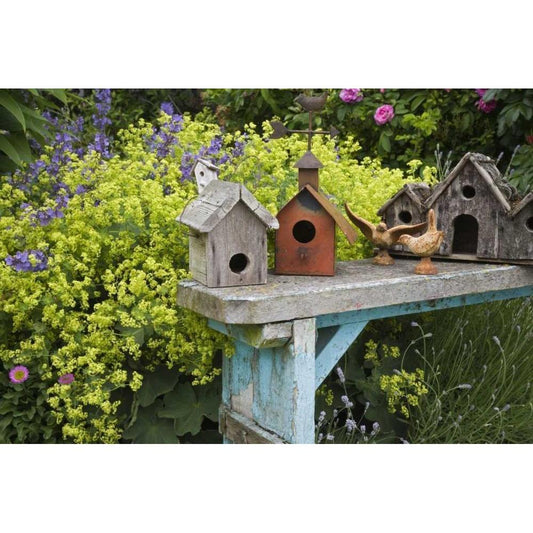 Bird houses on bench in garden Gold Ornate Wood Framed Art Print with Double Matting by Paulson, Don