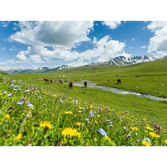 Horses on summer pasture The Suusamyr plain-a high valley in Tien Shan Mountains-Kyrgyzstan Gold Ornate Wood Framed Art Print with Double Matting by Zwick, Martin