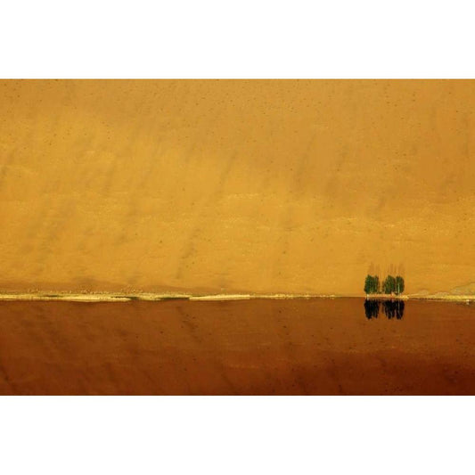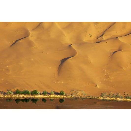 China, Badain Jaran Dune and trees by a lake Gold Ornate Wood Framed Art Print with Double Matting by Anon, Ellen