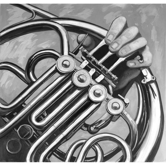 Musician with frech horn monochrome Gold Ornate Wood Framed Art Print with Double Matting by Atelier B Art Studio