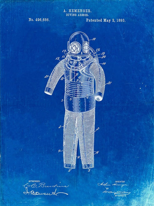 PP343-Faded Blueprint Hemenger Diving Armor Poster Black Ornate Wood Framed Art Print with Double Matting by Borders, Cole