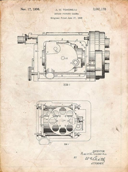 PP390-Vintage Parchment Motion Picture Camera 1932 Patent Poster Black Ornate Wood Framed Art Print with Double Matting by Borders, Cole