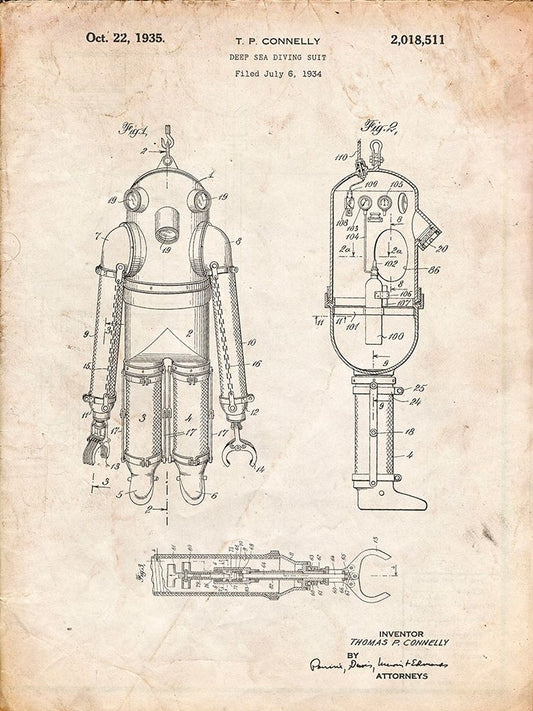 PP479-Vintage Parchment Deep Sea Diving Suit Patent Poster Black Ornate Wood Framed Art Print with Double Matting by Borders, Cole