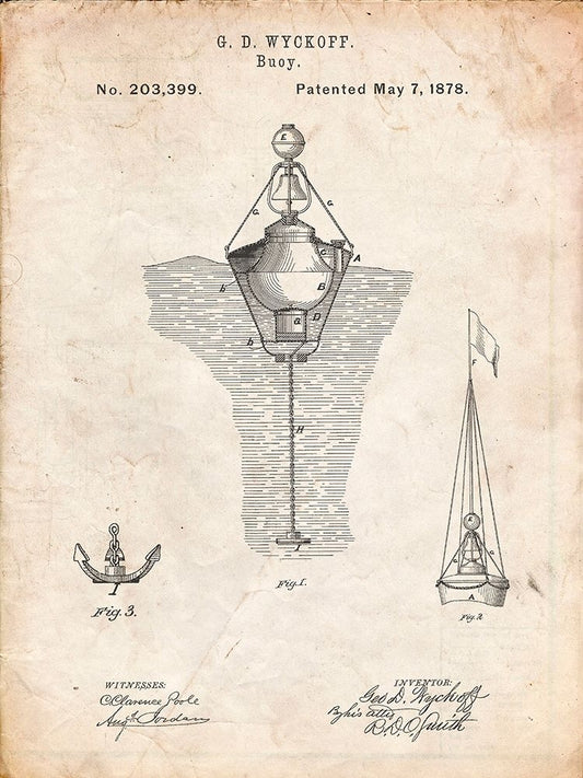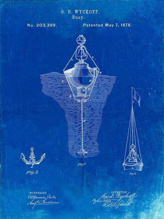 PP599-Faded Blueprint Water Buoy Patent Poster Black Ornate Wood Framed Art Print with Double Matting by Borders, Cole