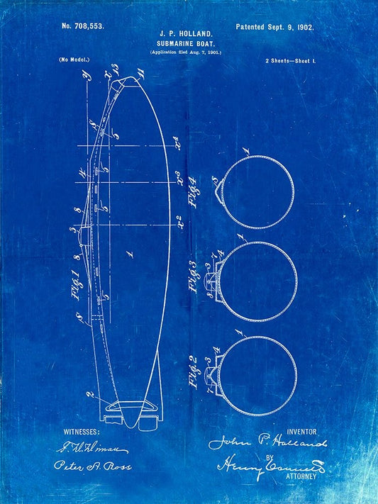 PP602-Faded Blueprint Holland 1 Submarine Patent Poster Black Ornate Wood Framed Art Print with Double Matting by Borders, Cole