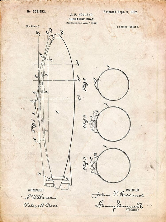 PP602-Vintage Parchment Holland 1 Submarine Patent Poster Black Ornate Wood Framed Art Print with Double Matting by Borders, Cole