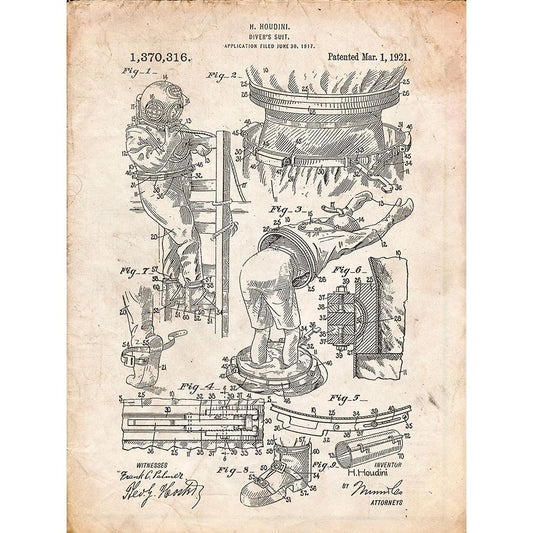 PP32-Vintage Parchment Houdini Diving Suit Patent Poster Black Modern Wood Framed Art Print with Double Matting by Borders, Cole