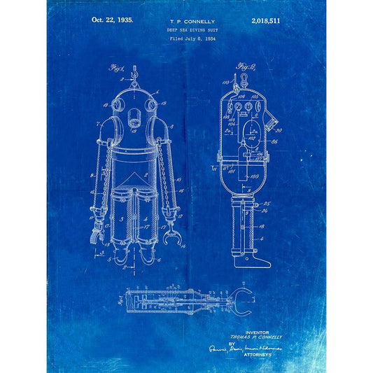 PP479-Faded Blueprint Deep Sea Diving Suit Patent Poster Black Modern Wood Framed Art Print with Double Matting by Borders, Cole