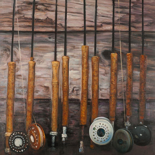 FISHING RODS ON WOOD White Modern Wood Framed Art Print by Atelier B Art Studio