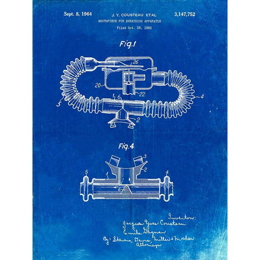 PP896-Faded Blueprint Jacques Cousteau Diving Mouthpiece Patent Poster White Modern Wood Framed Art Print by Borders, Cole