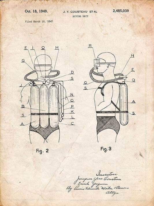 PP897-Vintage Parchment Jacques Cousteau Diving Suit Patent Poster White Modern Wood Framed Art Print with Double Matting by Borders, Cole