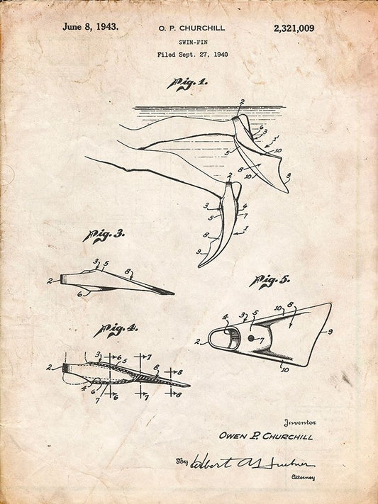 PP1079-Vintage Parchment Swim Fins Patent Poster White Modern Wood Framed Art Print with Double Matting by Borders, Cole