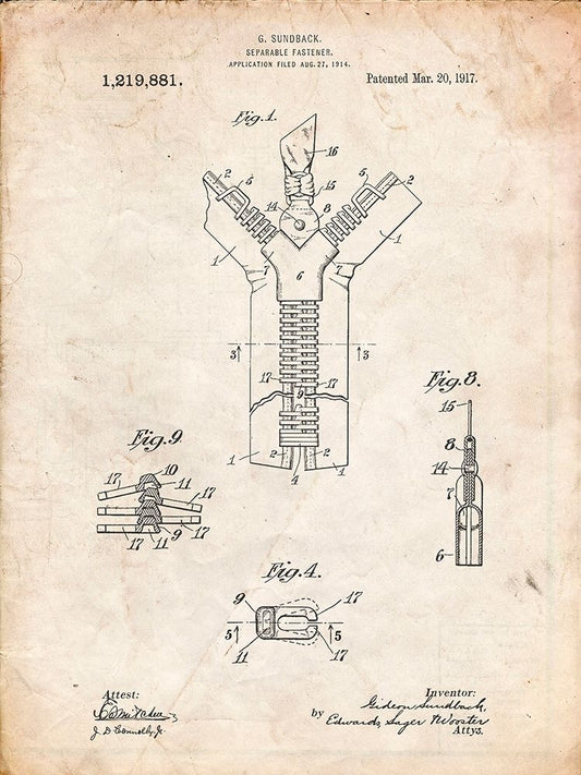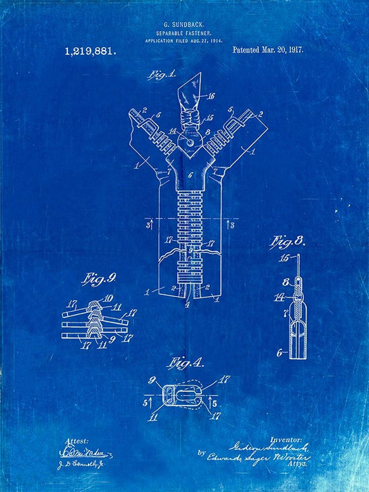 PP1143-Faded Blueprint Zipper 1917 Patent Poster White Modern Wood Framed Art Print with Double Matting by Borders, Cole