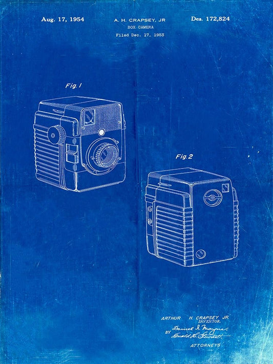 PP300-Faded Blueprint Kodak Brownie Bullseye 1954 Patent Poster White Modern Wood Framed Art Print with Double Matting by Borders, Cole