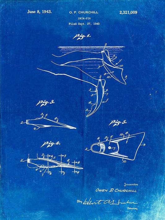 PP1079-Faded Blueprint Swim Fins Patent Poster White Modern Wood Framed Art Print with Double Matting by Borders, Cole
