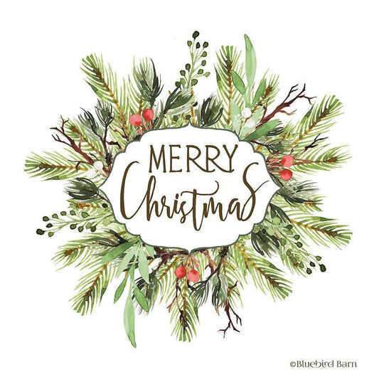 Merry Christmas Greenery I White Modern Wood Framed Art Print with Double Matting by Bluebird Barn