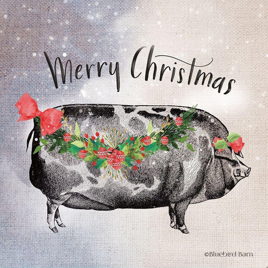 Vintage Christmas Be Merry Pig White Modern Wood Framed Art Print with Double Matting by Bluebird Barn